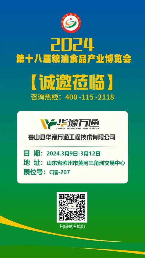 “新時(shí)代、新農(nóng)業(yè)、新展會(huì)、新成果、新糧機(jī)、新合作”。第十八屆糧油食品產(chǎn)業(yè)博覽會(huì),華豫萬(wàn)通期待與您在濱州展會(huì)現(xiàn)場(chǎng)相見(jiàn),共同見(jiàn)證糧油加工技術(shù)的創(chuàng)新發(fā)展。