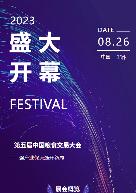為認(rèn)真落實(shí)總體國(guó)家安全觀,深入實(shí)施國(guó)家糧食安全戰(zhàn)略和鄉(xiāng)村振興戰(zhàn)略,推動(dòng)糧食產(chǎn)業(yè)高質(zhì)量發(fā)展,提高國(guó)家糧食安全保障水平,國(guó)家糧食和物資儲(chǔ)備局定于2023年8月26日至28日在河南省鄭州市召開第五屆中國(guó)糧食交易大會(huì)。